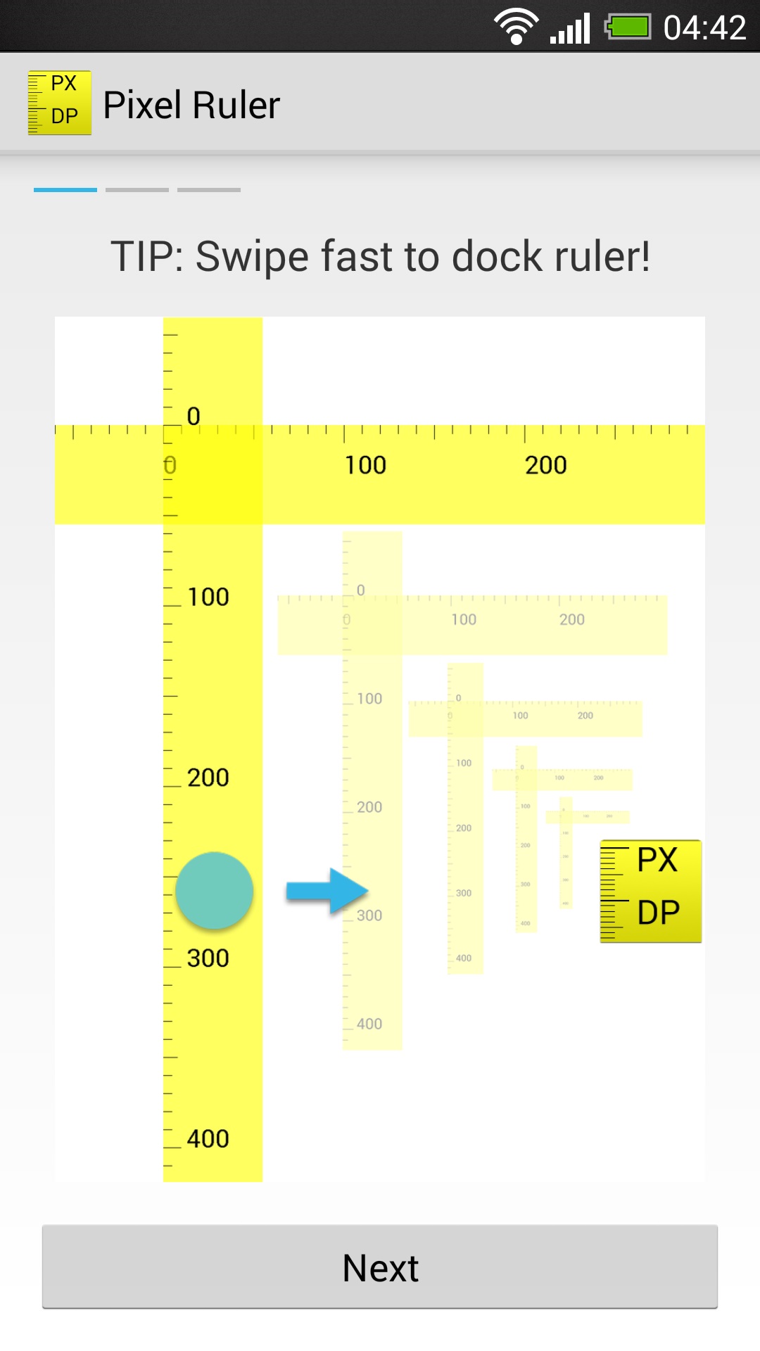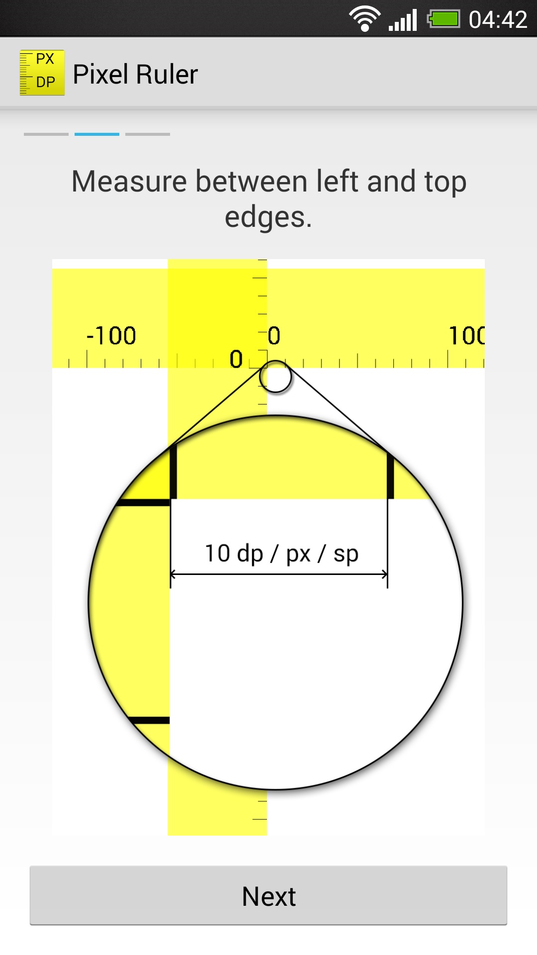 Podporováno je měření jak přímo v pixelech (px), tak i v density-independent pixelech (dp) a scale-independent pixels (sp), specializovaných jednotkách sloužících pro jednotné zobrazení nezávisle na DPI daného displeje. Výhodou je i možnost pravítka dokovat a odklidit je tak z pracovní plochy na okraj displeje.